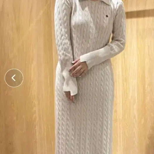 POLO BCS x LAGUNAMOON 콜라보 아이보리 케이블 짜임 니트 롱 원피스, 셔츠 칼라와 긴팔 디자인이 특징.