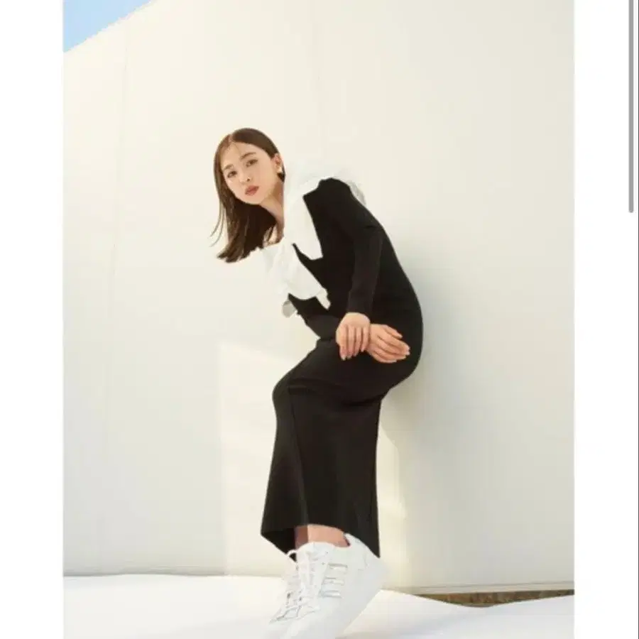화이트 블랙 티어드 긴팔 셔츠 원피스