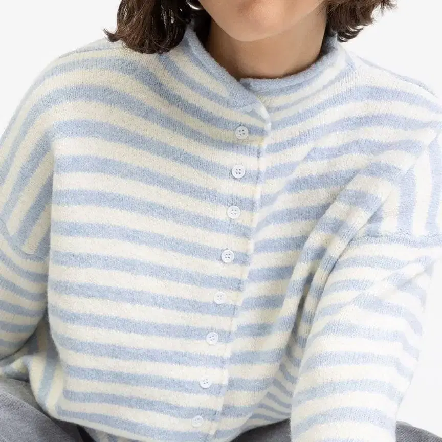 여유로운 핏감의 스트라이프 가디건. 하이 칼라. 플라켓 단추식. 총길이: 59cm, 허리 너비: 57cm (원사이즈) 컬러 - 블루 계열