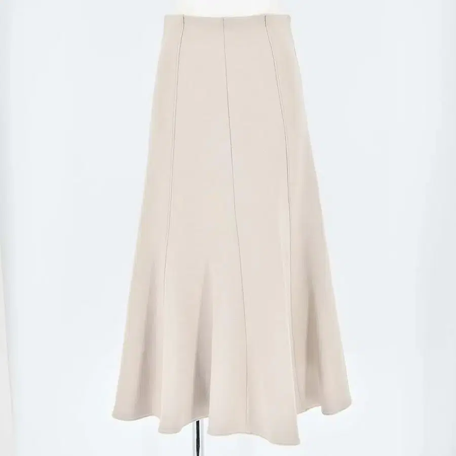 부드러운 원단의 베이지 플레어 스커트, 플리츠 디자인이 특징.