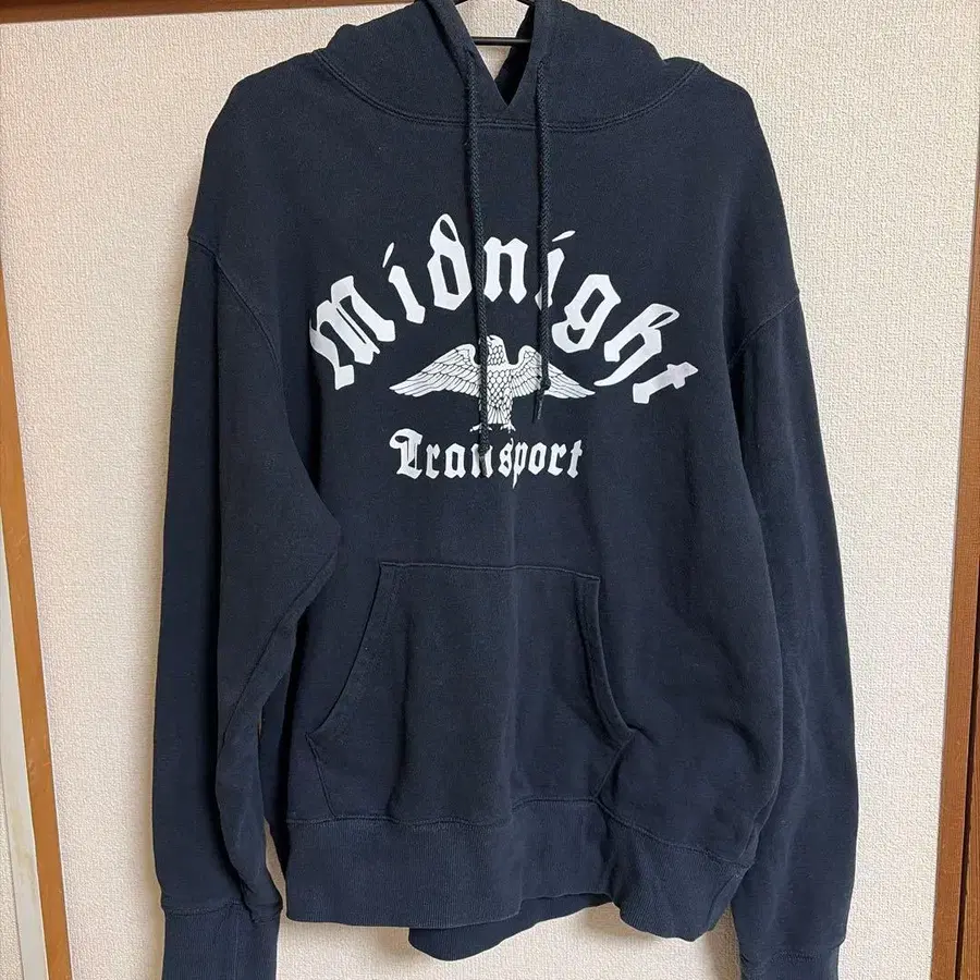 이글 모티브 프린트가 특징인 블랙 후드티. - 색상: 블랙 - 디자인: 프린트 포함 - 텍스트: Midnight Transport - 특징: 이글 모티브 - 소매: 프린트 포함 방문해 주셔서 감사합니다.