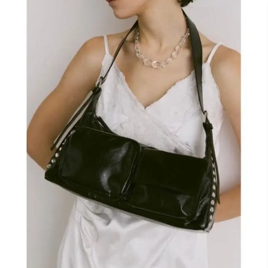 ★ 미사용 새상품 ※ 받은 상태 그대로 접어서 보관했습니다. 뒤쪽에 약간의 접힘 자국이 있습니다 (사진 4 참조). 스터드가 달린 블랙 합성 피혁 숄더백. - 색상: 블랙 - 디자인: 포켓 부착 숄더백 - 소재: 합성 피혁 - 장식: 스터드 부착 - 안쪽 소재: 나일론 방문해 주셔서 감사합니다.