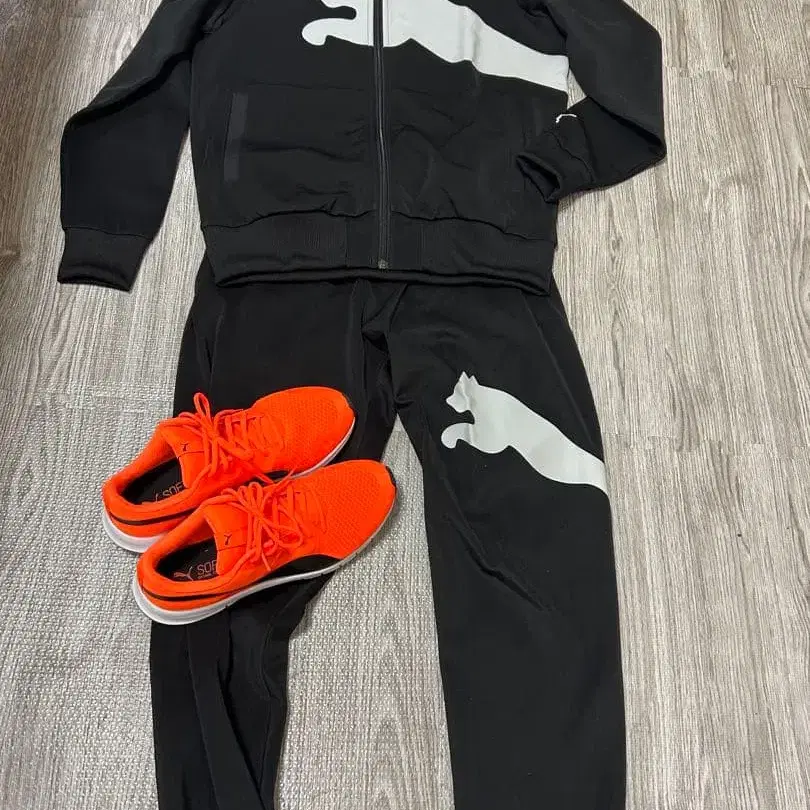 Puma의 로고가 특징인 블랙 저리 세트와 오렌지 러닝화 세트입니다. - 브랜드: Puma - 색상: 블랙 - 신발 색상: 오렌지 - 디자인: 로고 - 스타일: 저리 세트 - 신발 스타일: 러닝화 26cm 방문해 주셔서 감사합니다.