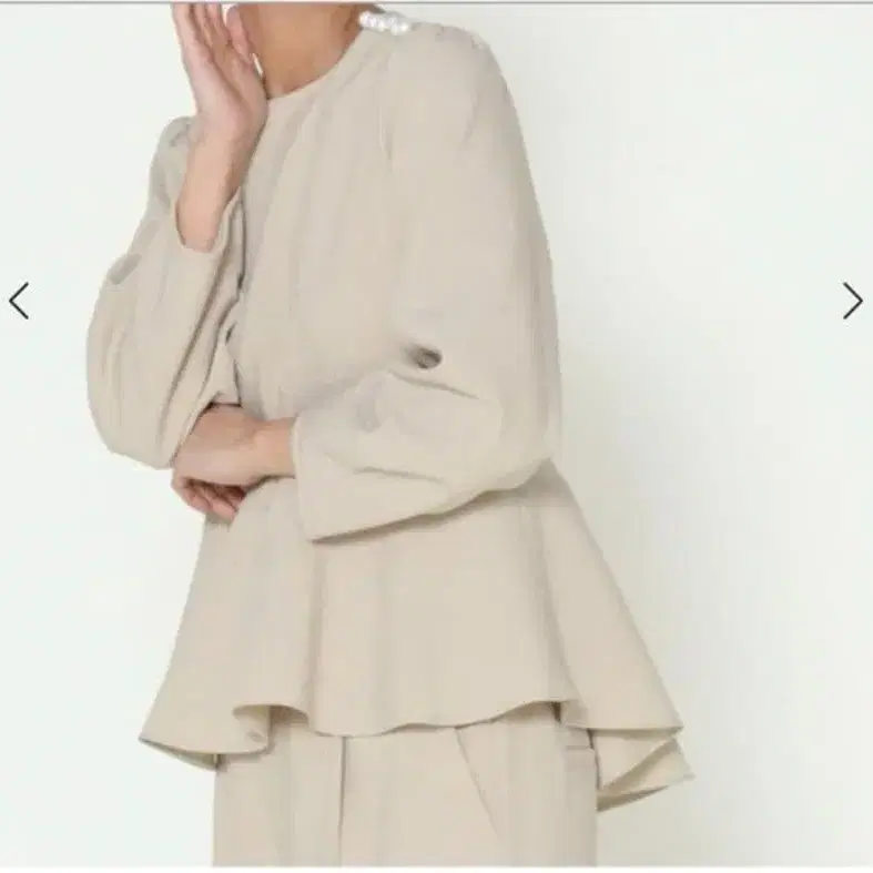 허리 위치에서 절개된 페플럼 실루엣이 고급스러운 인상을 줍니다.