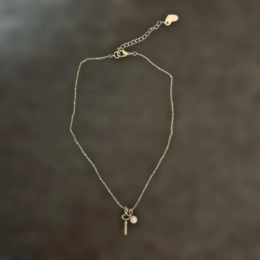 열쇠와 펄 참이 특징인 목걸이, 조절 기능으로 길이 조정 가능.