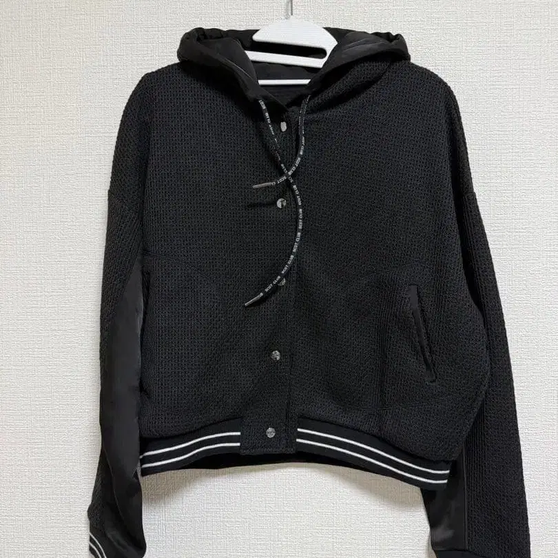 후드 부착 블랙 크롭 후드티, 스트라이프 리브 디자인. - 색상: 블랙 - 소재: 폴리에스테르 100% - 사이즈: 38 - 디자인: 후드 부착, 스트라이프 리브 - 스타일: 크롭 기장 - 정가 22,000엔 방문해 주셔서 감사합니다. 사이즈 - M