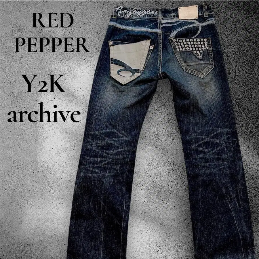 RED PEPPER 헤이세이 그런지 하라주쿠 00s 00's 아카이브 사이즈 W31 RED PEPPER의 스터드 데님입니다. 뒷면에는 스터드, 히게 가공, 주름 가공, 데미지 가공, 빈티지 가공이 들어간 데님입니다. 평면 치수 측정 허리 43 총장 107 밑위 (앞) 25 인심 80 밑단 폭 21 상태 밑단에 약간의 데미지가 있지만, 눈에 띄는 찢김이나 얼룩이 없는 상품입니다.