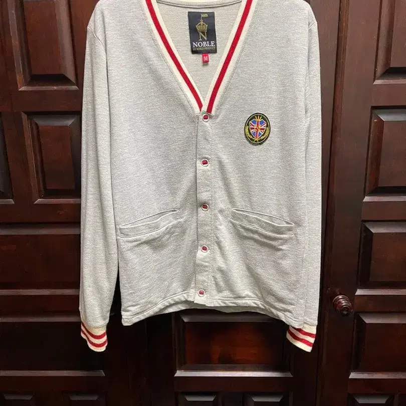 그레이 색상의 버튼이 달린 가디건, 빨간색 스트라이프 리브, 로고 자수 포함. - 브랜드: NOBLE - 사이즈: M - 색상: 그레이 - 디자인: 버튼이 달린 가디건 - 특징: 빨간색 스트라이프 리브 - 자수: 로고 자수 있음 방문해 주셔서 감사합니다. 사이즈 - M