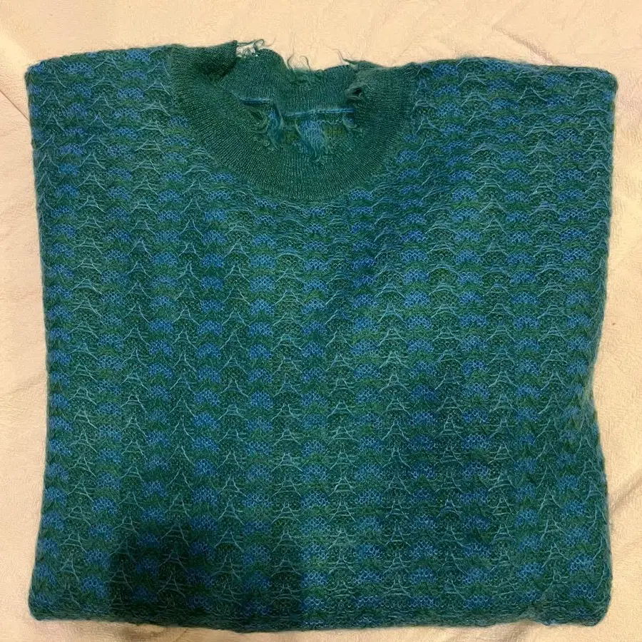 물결 모양의 짜임이 특징인 그린 컬러와 파란색의 스웨터입니다.