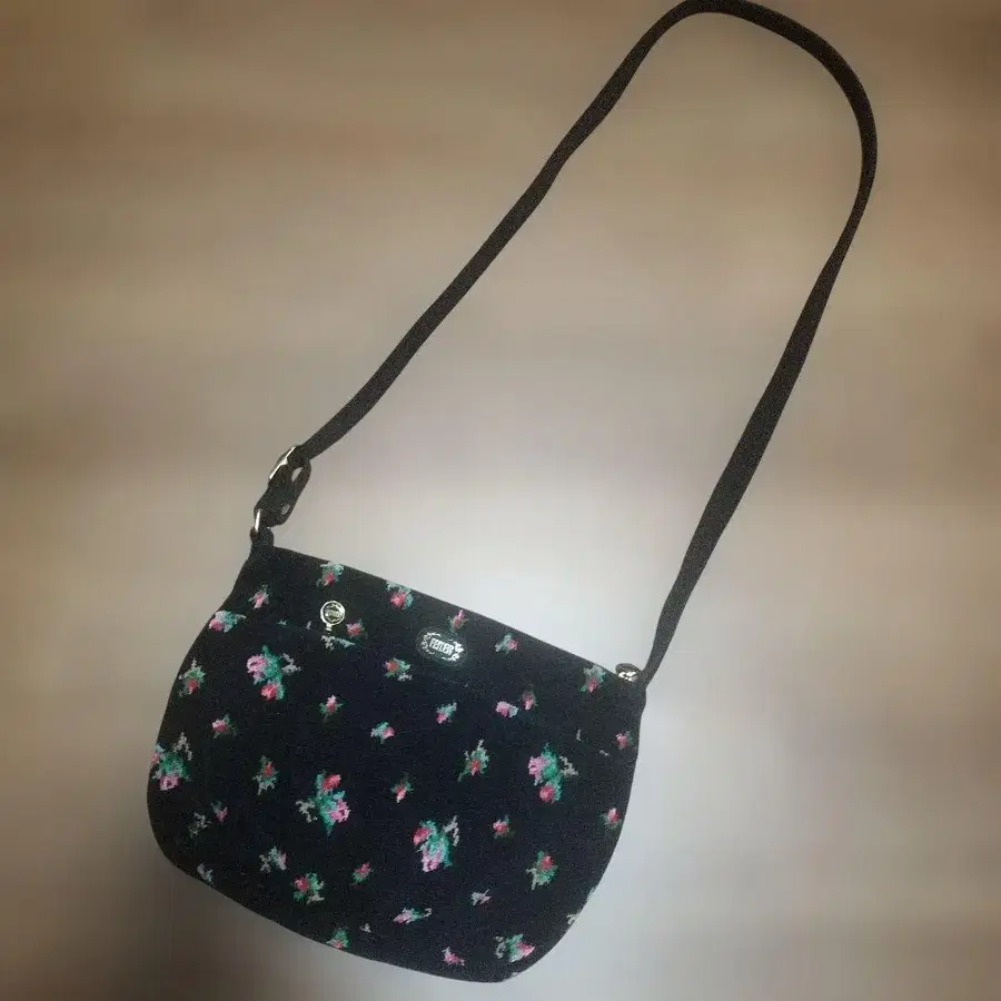 코듀로이 소재의 블랙 꽃무늬 숄더백, 조정 가능한 스트랩 포함.