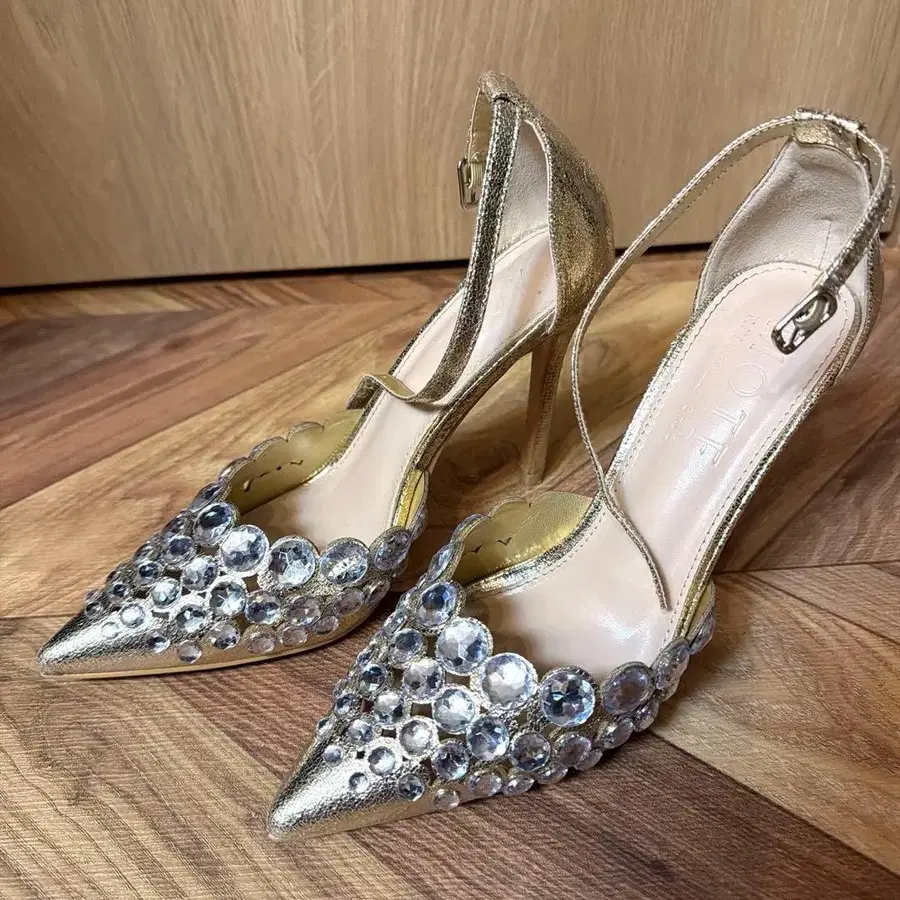 구매 시 뒷면이 매끄러워 미끄럼 방지 시트를 부착했습니다. 결혼식 때 한 번만 사용하여 새상품급입니다 ☺︎ 골드 스톤 장식의 스틸레토 하이힐. - 색상: 골드 - 장식: 스톤 포함 - 디자인: 스틸레토 - 밑창: 러버 솔 - 스트랩: 앵클 스트랩 방문해 주셔서 감사합니다. 색상 - 골드 계열 힐 높이 - 11cm 발가락 - 스틸레토 밑창 힐 모양 - 핑힐 얼룩, 찢김, 냄새 등 - 없음