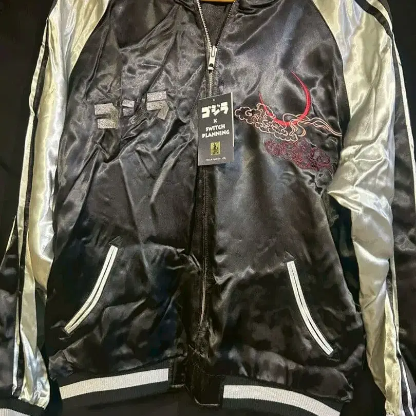 백 (뒷면): 포효하는 고질라의 모습을 다색의 실을 구분하여 입체적인 자수로 표현. 주변의 번개 (또는 불꽃이나 도시 풍경) 연출이 고질라의 강력한 파워를 상징합니다.