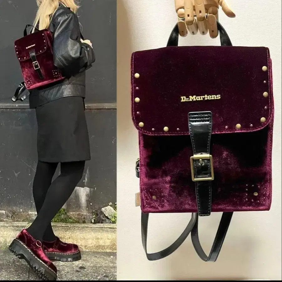자동 번역되었어요. 원문보기버건디 벨벳 소재에 스터드 장식이 더해진 Dr. Martens 백팩.