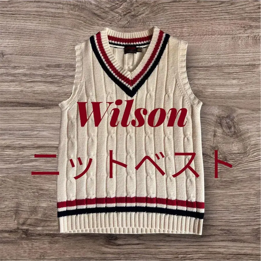 Wilson의 아이보리 니트 V넥 베스트, 빨간색과 검은색 스트라이프 포함.
