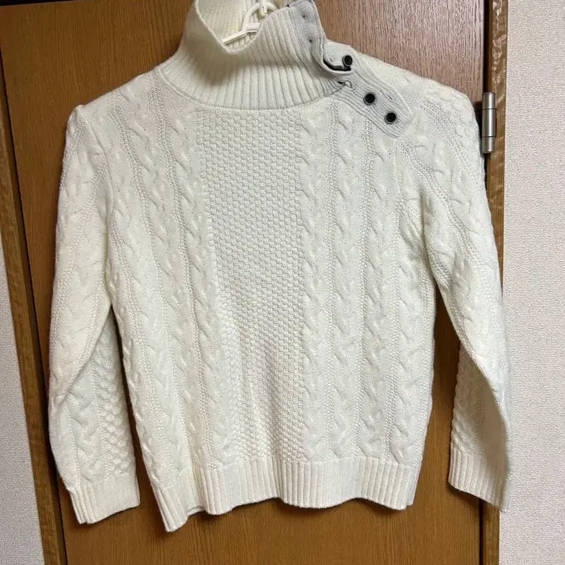 케이블 니트 디자인의 화이트 터틀넥 스웨터. 매우 따뜻한 스웨터로 몇 번 착용한 새상품급입니다. - 색상: 화이트 - 디자인: 케이블 니트 - 특징: 터틀넥, 버튼 포함 - 스타일: 세미 핏 - 소재: 니트 어깨 너비/가슴 너비/소매 길이/기장 어깨 너비 래글런 슬리브 가슴 너비 - 50cm 소매 길이 - 60cm 기장 - 61cm 컬러 - 화이트 계열 넥 - 터틀넥 얼룩, 찢김, 냄새 등 - 없음 사이즈 - L