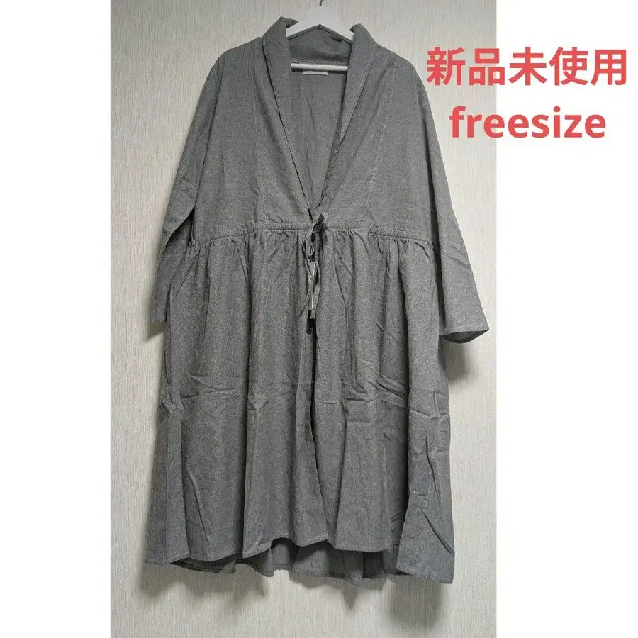 허리 리본이 달린 심플한 그레이 롱 원피스, 긴팔 디자인으로 계절에 상관없이 착용 가능.