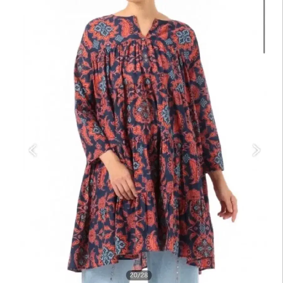 오리지널로 제작한 에스닉 패턴이 시선을 사로잡는 화려한 원피스입니다. 밑단으로 갈수록 풍성하게 볼륨을 준 티어드 디자인이 여성스러움을 돋보이게 합니다. 무릎 위 기장의 미니 기장과 가벼운 코튼 슬라브 소재를 사용한 시즌 스타일에 딱 맞는 한 벌입니다. 단품으로 입는 것은 물론, 데님과 레이어드하는 등 다양한 스타일을 즐겨보세요. 면 100% 36: 기장 90 어깨 너비 62 소매 길이 37.5 가슴 너비 82 소매 폭 21.5 개인 측정입니다.