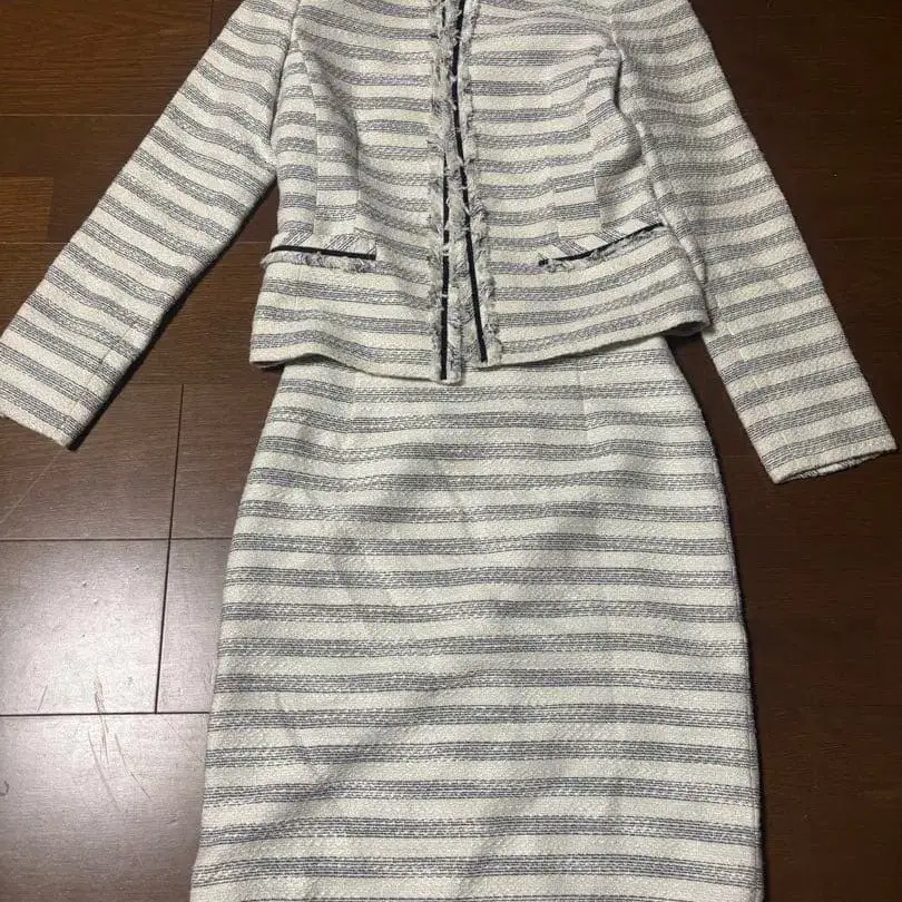 화이트와 블루 스트라이프 트위드풍 셋업, 프린지 디테일 포함. - 브랜드: COMME CA ISM - 색상: 화이트/블루 스트라이프 - 스타일: 자켓과 스커트 셋업 - 소재: 트위드풍 원단 - 디자인: 프린지 디테일 포함 방문해 주셔서 감사합니다.