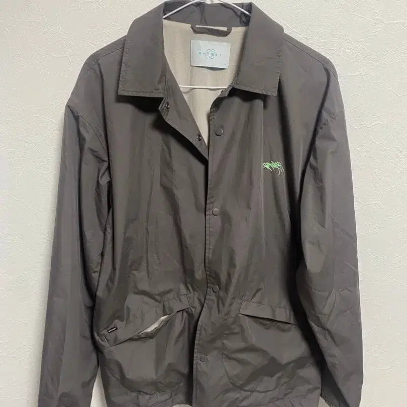 나일론 소재의 그레이 버튼 자켓, 사이즈 L, WHIMSY 브랜드.