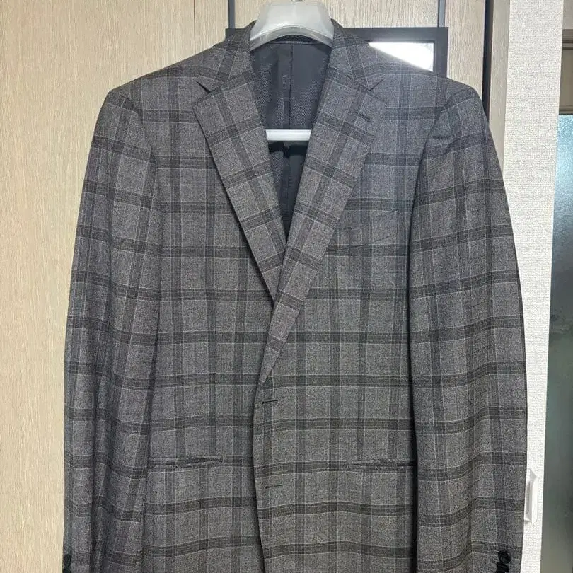 그레이 계열 체크 무늬 테일러드 자켓과 팬츠 세트.