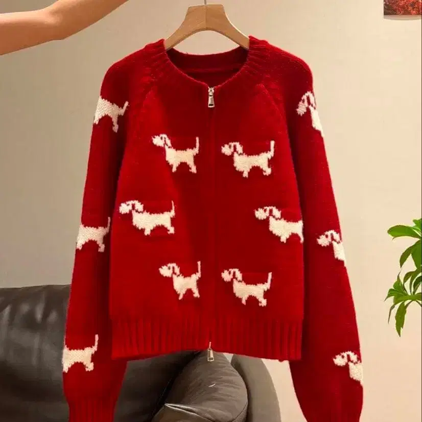강아지 패턴 빨간색 풀 집업 니트 스웨터 (긴팔)