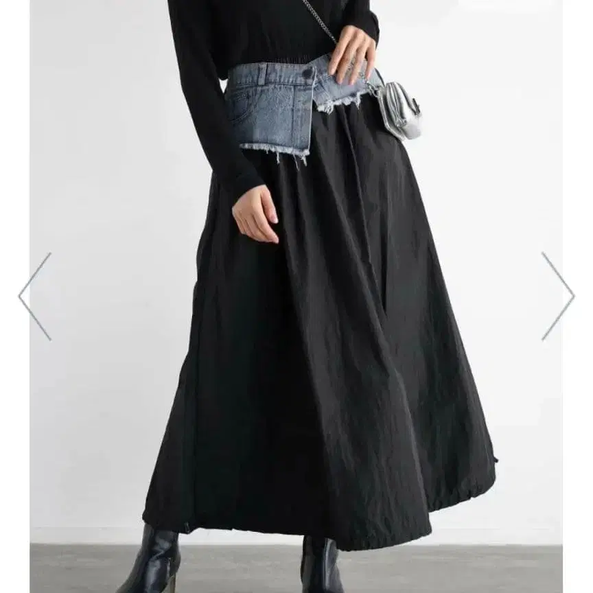 데님 원단과 은은한 광택의 나일론 원단을 도킹시킨 개성 넘치는 이소재 절개 스커트.