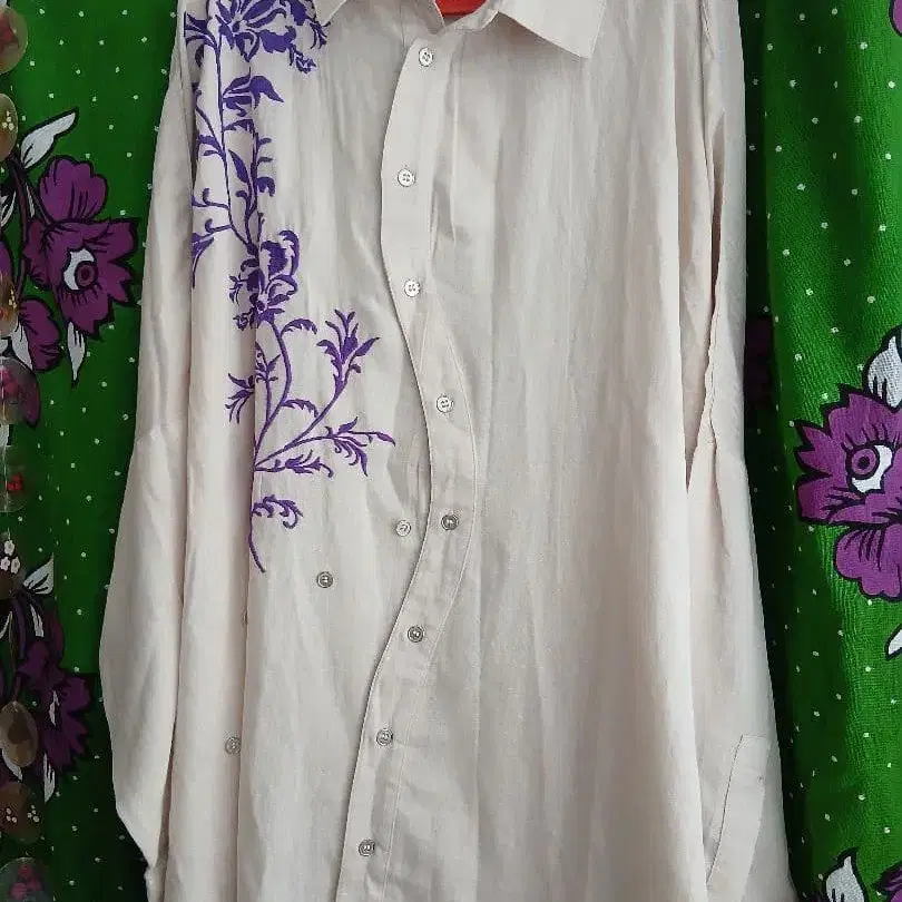 총길이 약 75cm, 가슴 너비 약 85cm 아이보리 색상에 보라색 자수 눈에 띄는 얼룩은 없습니다