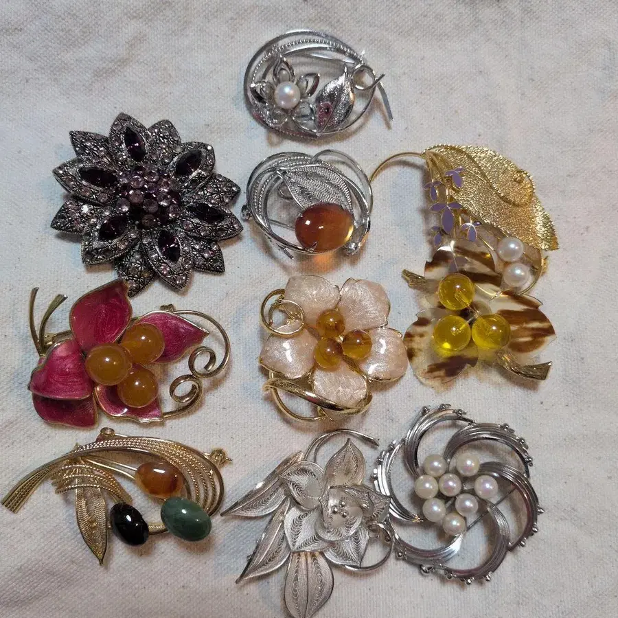 다양한 꽃 모티브의 브로치 세트, 빈티지풍 디자인. - 디자인: 꽃 모티브 - 소재: 금속, 비즈 - 색상: 핑크, 보라색, 금색, 화이트, 그린, 오렌지 - 스타일: 빈티지풍 - 수량: 9개 세트 방문해 주셔서 감사합니다. 낱개 판매는 불가합니다.
