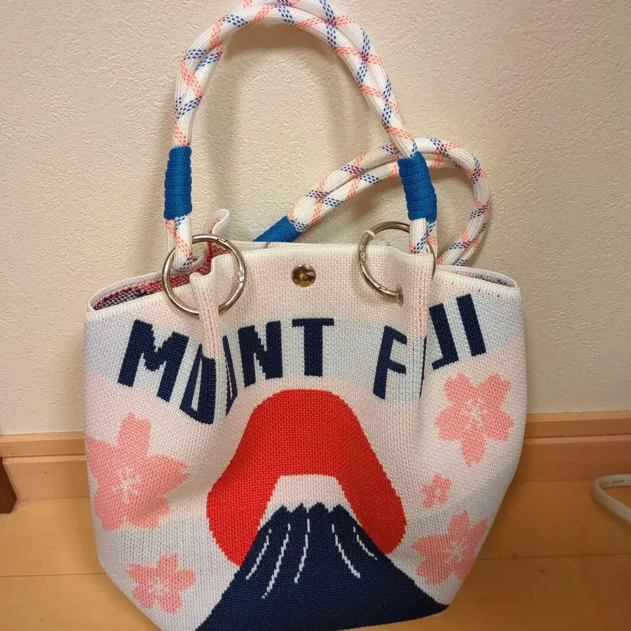후지산과 벚꽃 디자인이 특징인 니트 백. - 디자인: 후지산과 벚꽃 모티브 - 색상: 화이트, 핑크, 블루 - 소재: 니트 소재 - 핸들: 뜨개질 핸들 - 사이즈: 중형 - 브랜드: Okey 사이즈 세로 22cm 가로 23cm 폭 14cm 방문해 주셔서 감사합니다.