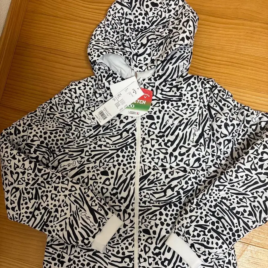 경량 소재의 후드 부착 화이트 블랙 하트 무늬 자켓.