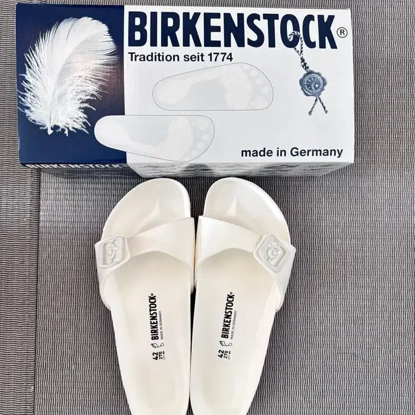 가볍고 쾌적한 EVA 소재의 화이트 샌들. - 브랜드: BIRKENSTOCK - 사이즈: 42 27.0 상당 - 색상: 화이트 - 소재: EVA 방문해 주셔서 감사합니다. 미사용 새상품입니다. 사이즈 - 27cm