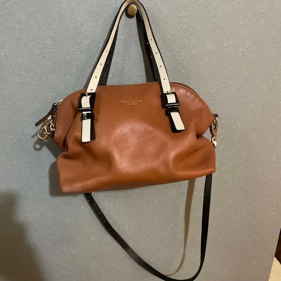 브라운 색상의 숄더백이며, 안쪽은 체크 무늬로 특징이 있고 귀엽습니다.
