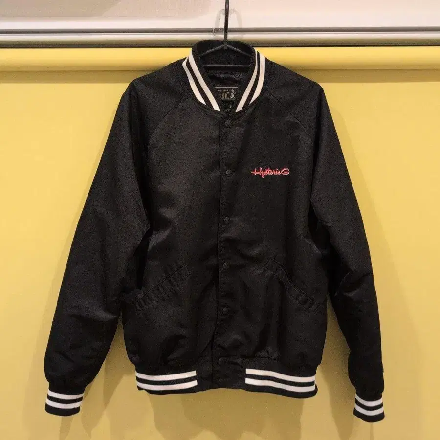 스트라이프 리브가 달린 블랙 스타디움 점퍼, HYSTERIC 로고 포함.