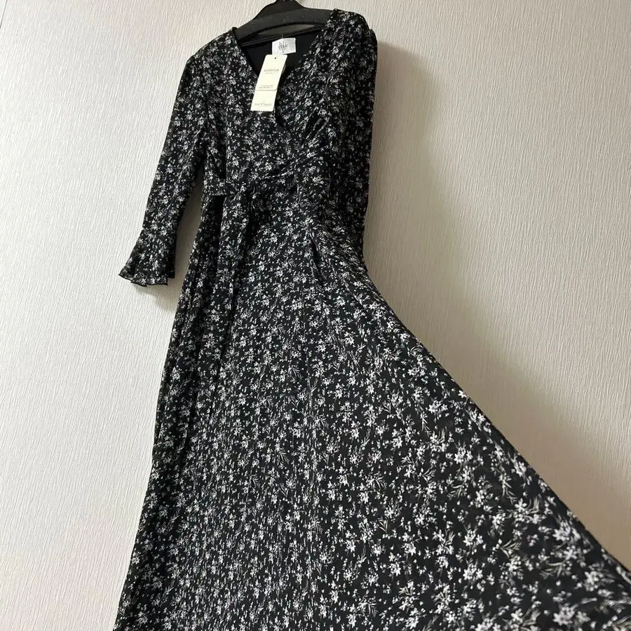 블랙과 화이트 꽃무늬 플레어 슬리브 랩 드레스, 맥시 길이로 엘레강트한 인상을 줍니다. 안감 있음으로 따뜻하게 입을 수 있습니다.