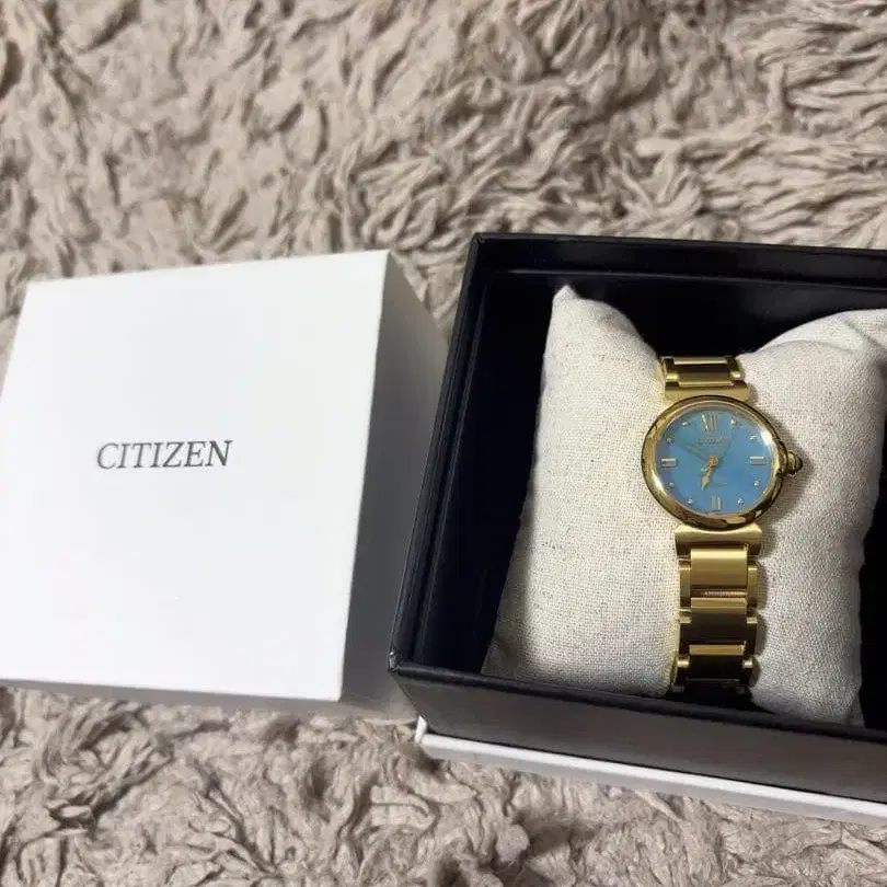 골드 팔찌와 블루 다이얼이 특징인 쿼츠 아날로그 손목시계. - 브랜드: CITIZEN - 색상: 골드/블루 - 스타일: 아날로그 - 타입: 쿼츠 - 부속품: 상자 구매 후 미사용입니다. 방문해 주셔서 감사합니다.