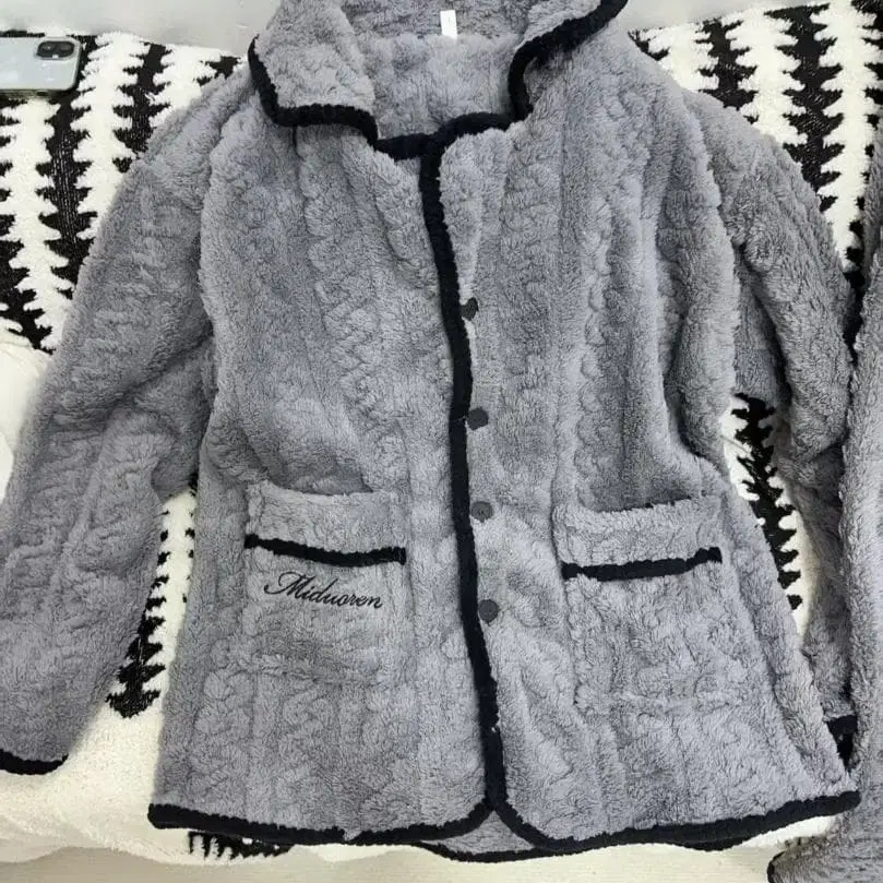 플리스 소재의 그레이 파자마 세트입니다. 자켓과 팬츠 조합으로, 앞면에 포켓과 자수가 특징입니다. - 색상: 그레이 - 디자인: 버튼이 있는 자켓 스타일 - 소재: 플리스 - 세트 내용: 자켓과 팬츠 세트 - 포켓: 앞면에 포켓 있음 방문해 주셔서 감사합니다.