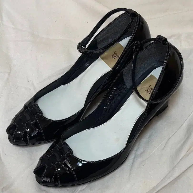 오픈토 디자인의 블랙 펌프스, 낮은 힐로 쾌적한 착용감. - 색상: 블랙 - 디자인: 오픈토 - 밑창 소재: 합성 밑창 - 스트랩 유무: 있음 - 힐 높이: 낮은 힐 방문해 주셔서 감사합니다. 사이즈 - 24cm