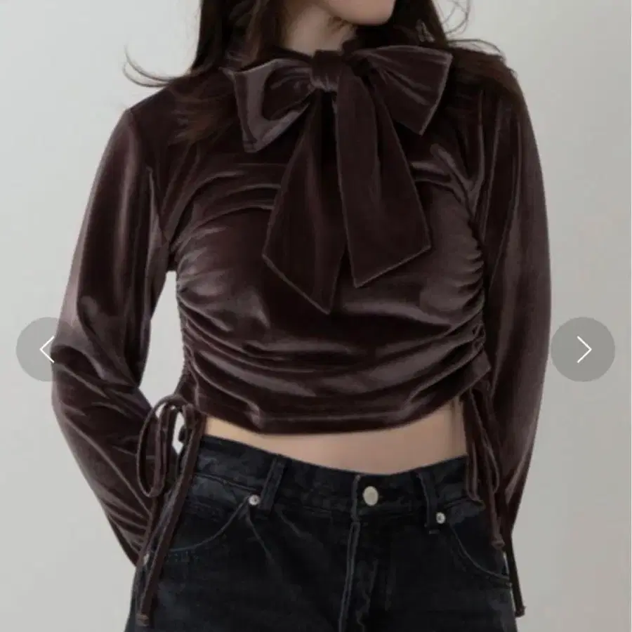다크 브라운 벨로아 소재에 리본이 달린 오픈 백 디자인의 긴팔 상의입니다.