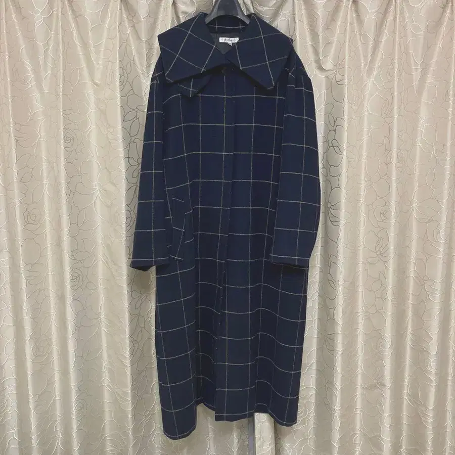 큰 옷깃과 체크 무늬가 특징인 네이비 색상의 롱 코트. - 색상: 네이비 - 패턴: 체크 - 옷깃 디자인: 큰 옷깃 - 포켓: 사이드 포켓 방문해 주셔서 감사합니다. 사이즈 - M