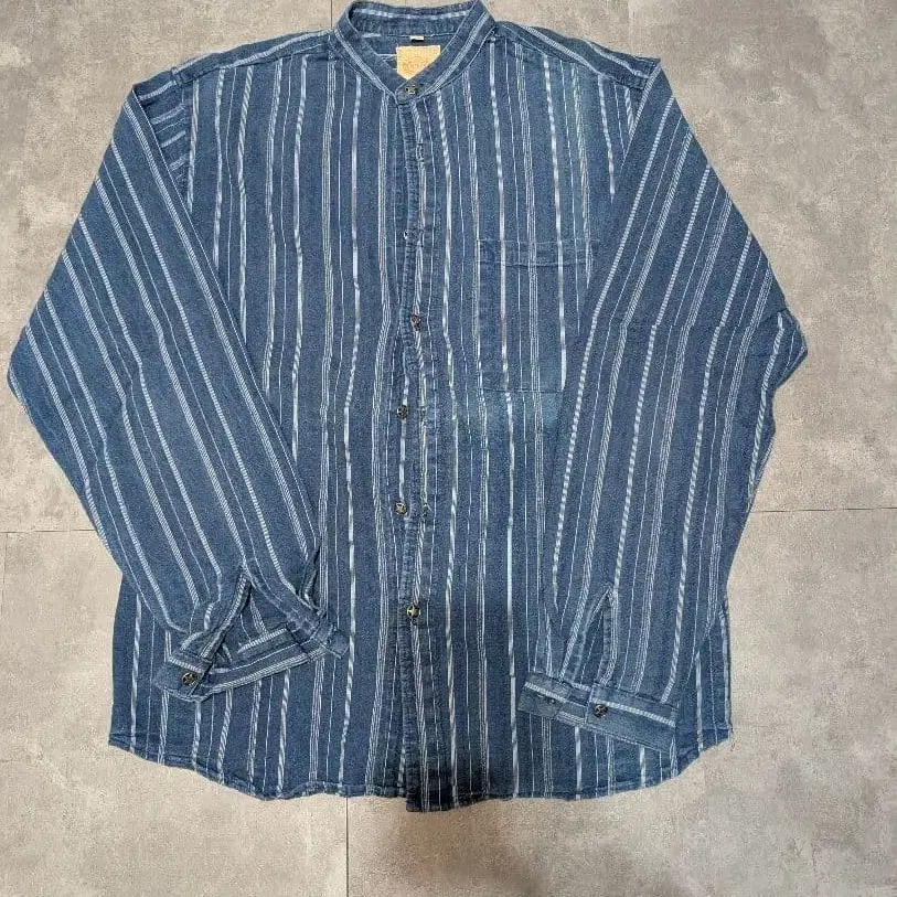 데님 셔츠 노카라 밴드 카라 M 사이즈 블루 화이트 스트라이프