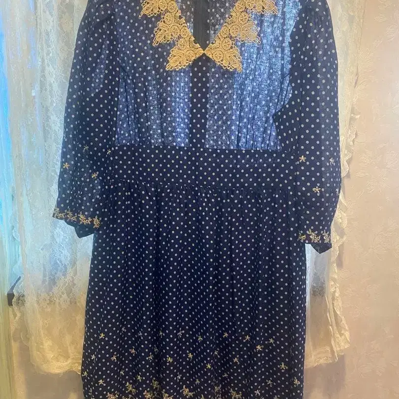 할머니께서 입으셨던 현지 부티크 등에서 구매한 상당히 오래된 비침이 있는 도트 무늬 원피스입니다. 사진의 색감이 가까울 것이라고 생각합니다. 큰 얼룩 등은 보이지 않지만, 신경 쓰이시는 분은 구매를 삼가해 주시기 바랍니다. #쇼와 레트로 #빈티지 #구제 의류 #레트로 네이비 도트 무늬 원피스, 레이스 카라 부착, 긴팔. - 색상: 네이비 - 디자인: 도트 무늬 - 옷깃 장식: 레이스 - 소매 길이: 긴팔