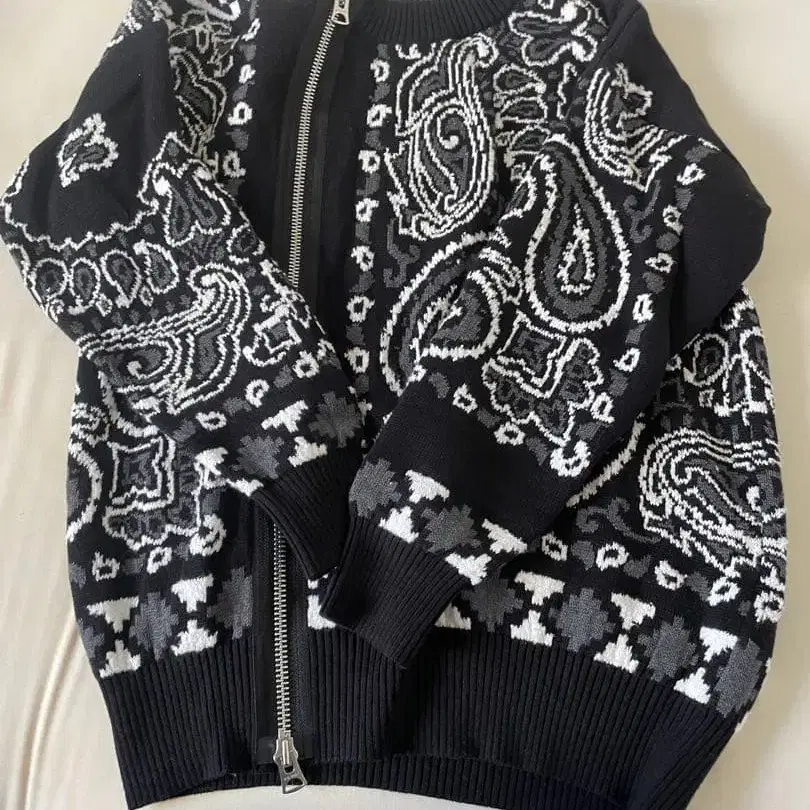 시착만 한 상품이지만, 택은 제거했습니다. 페이즐리 무늬의 풀 집업 니트 스웨터로, 리브 편직된 소매와 밑단이 특징입니다. - 색상: 블랙/화이트 - 디자인: 페이즐리 무늬 - 지퍼: 풀 집업 - 소재: 니트 - 소매: 리브 편직 - 밑단: 리브 편직 방문해 주셔서 감사합니다.