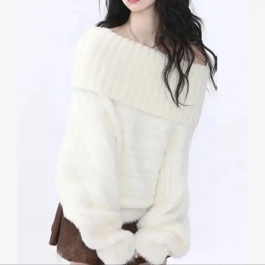 Mars 퍼 달린 리본 오프숄더 니트 화이트