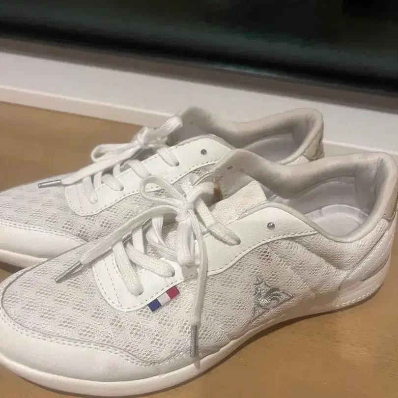 메쉬 소재의 화이트 스니커즈, 캐주얼 스타일에 최적.