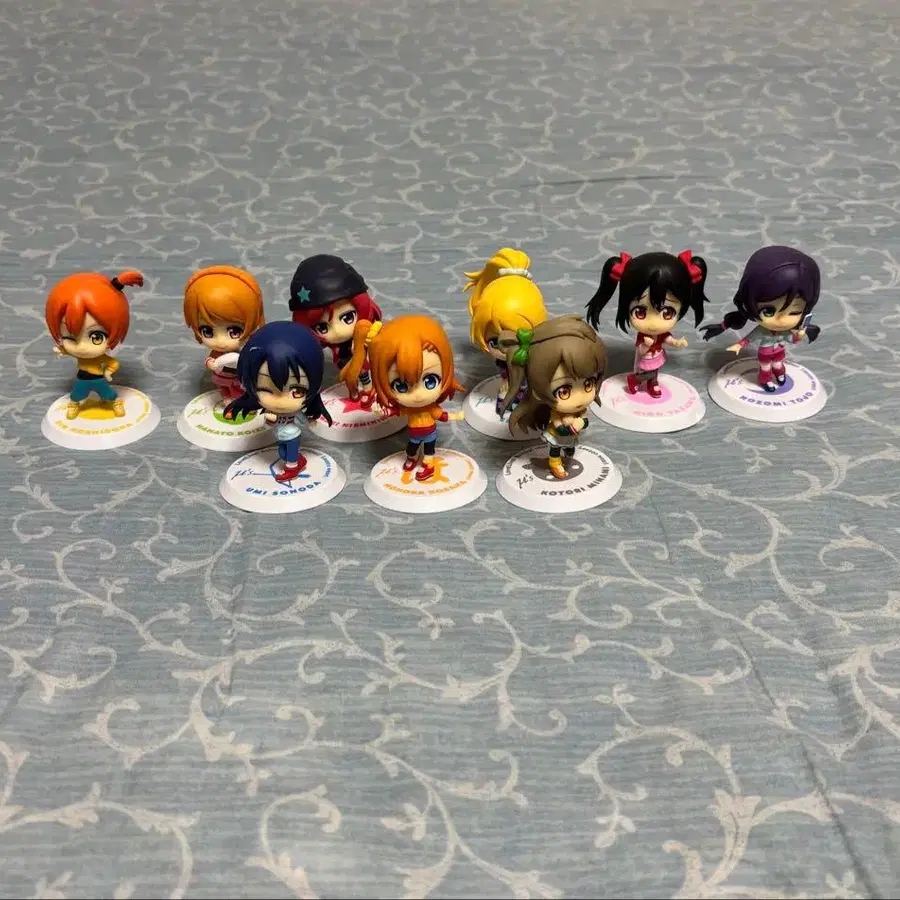 러브 라이브! 미니 피규어 9개 세트, 각 캐릭터별 개별 디자인이며 스탠드가 포함되어 있습니다.