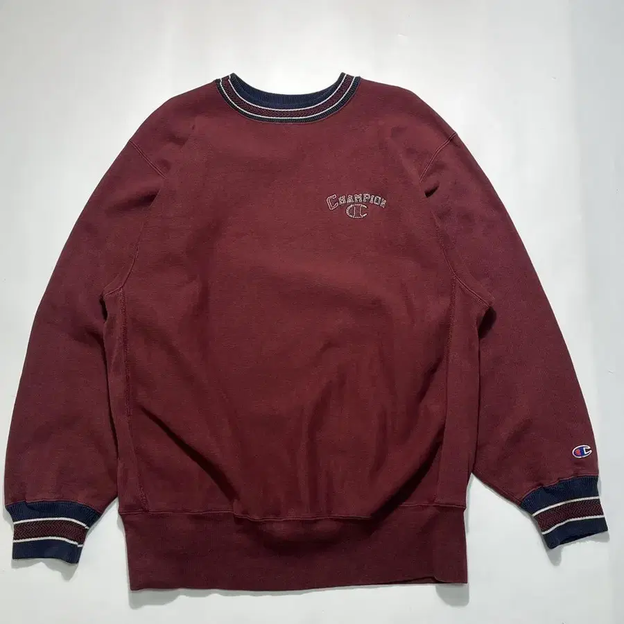 버건디 본체에, 목 부분과 소매에 네이비 x 화이트 리브 라인을 넣은 '변칙 리버스'. 가슴 로고도 작게 자수로, 일반적인 무지 리버스에는 드문 구성입니다.