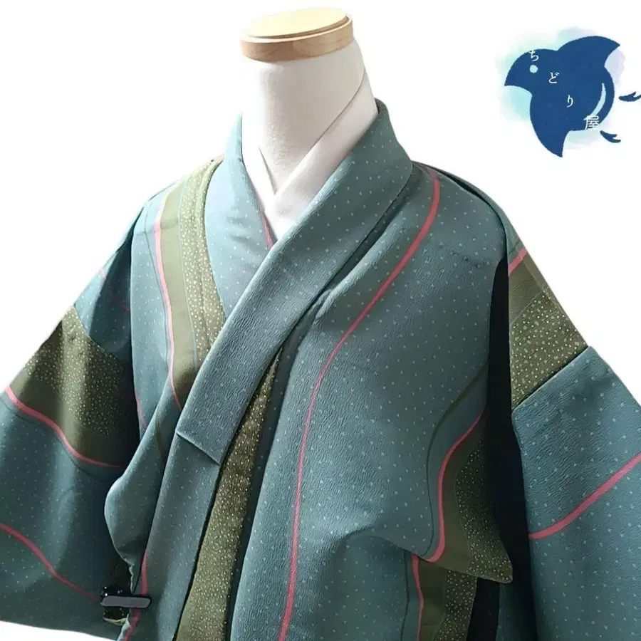 C39 치도리야 기모노 코몬 워셔블 기모노 화학 섬유 스트라이프 그린