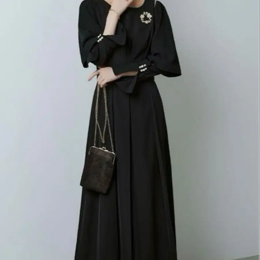 컨디션 최상 루일 에 부티크 플라워 모티브와 펄 장식이 더해진 엘레강트한 블랙 롱 드레스. - 색상: 블랙 - 스타일: 롱 드레스 - 디자인: 펄 장식 - 소매 스타일: 벌룬 슬리브