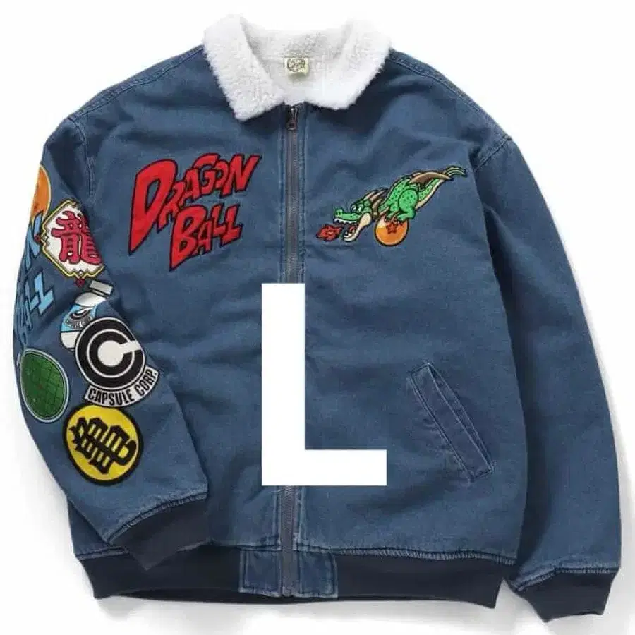 드래곤볼 디자인이 특징인 데님 자켓. - 디자인: 드래곤볼 자수가 놓인 데님 자켓 - 색상: 데님 블루 - 소재: 데님, 플리스 옷깃 - 특징: 프론트 지퍼, 사이드 포켓 - 자수: 캐릭터와 로고 자수가 복수 있음 방문해 주셔서 감사합니다.