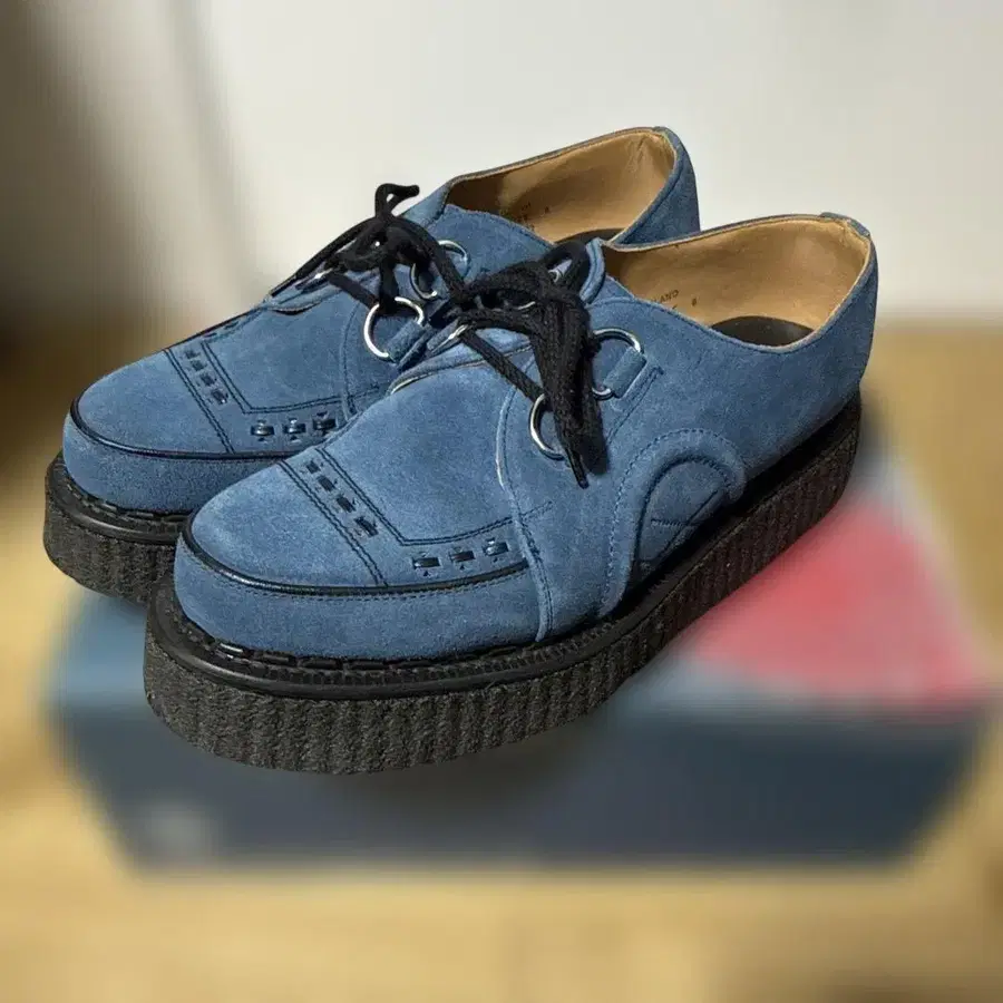 별주 래리 x 조지 콕스 크리퍼 슈즈 사이즈: UK8(27cm) 착용 횟수 2~3회의 새상품급으로 밑창 마모도 없습니다. 택도 있습니다. 색상: 미디엄 블루 (짙은 파랑보다는 약간 탁한 파랑입니다)